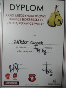 W Krakowie rozegrano trzydniowy  XXXIX Międzynarodowy Turniej Bokserski o ,, ZŁOTĄ RĘKAWICĘ WISŁY”. Sensei Wiktor Czopek również oprucz karate ,,boksuje” i na tych zawodach zdobył pierwsze miejsce w kategorii -75 kg – gratulujemy sukcesu!!!